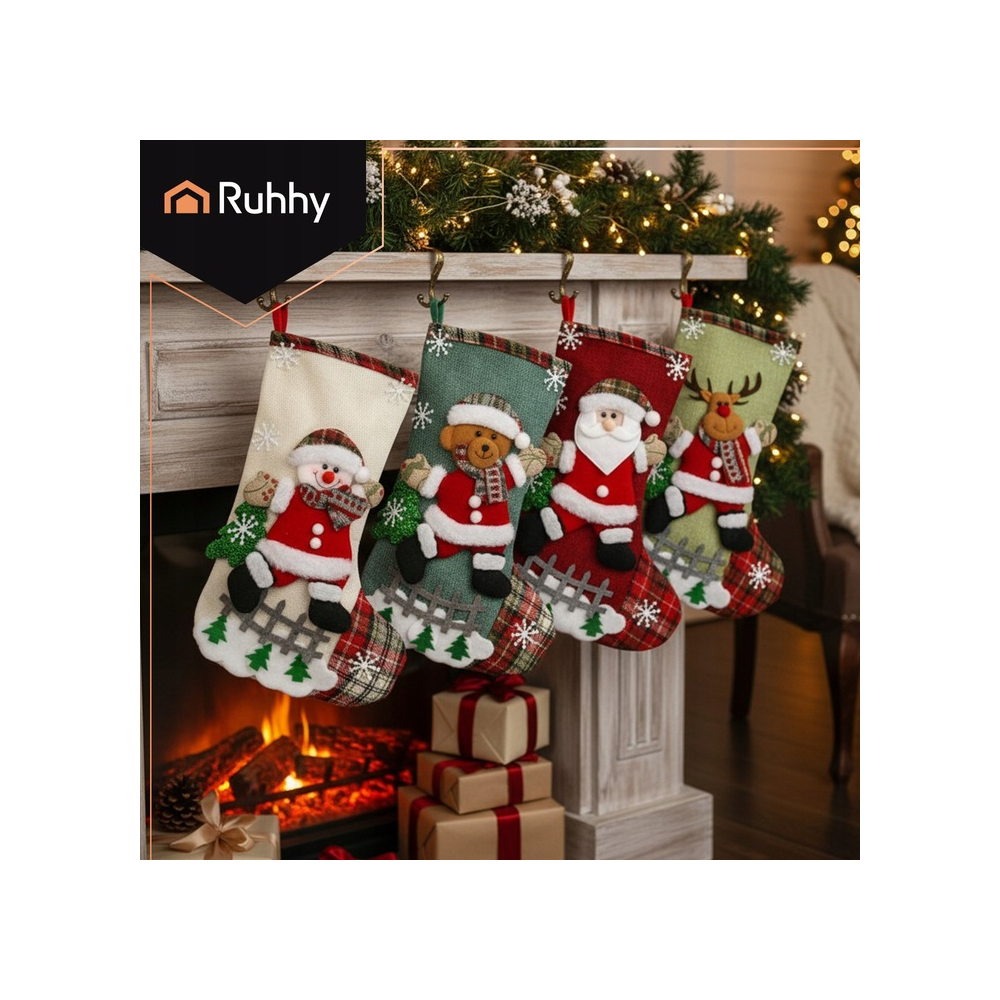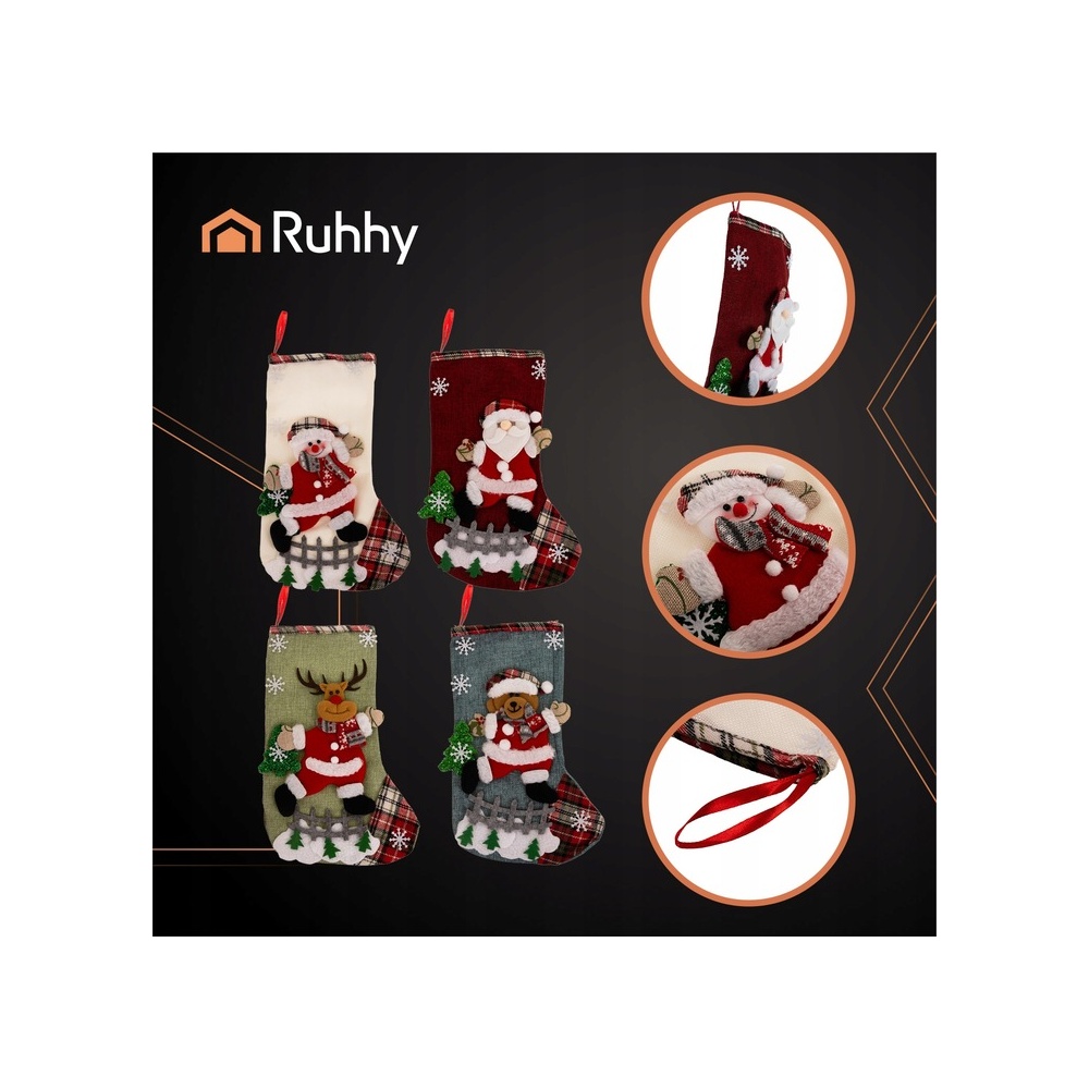 Brändi sokid RUHHY Need on ideaalne täiendus pidulikule sisekujundusele ja ainulaadne viis kingituste pakkimiseks. Rikkalikult kaunistatud jõuluvana, põhjapõdra, lumememme ja kaisukaru kujundustega toovad need teie koju maagilise jõulumeeleolu ning nende klassikalised värvid sobivad kaunilt teiste kaunistustega . Neljaosaline komplekt võimaldab teil luua ühtse ja silmatorkava kaunistuse, mis koheselt tähelepanu köidab ja külalisi rõõmustab.