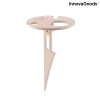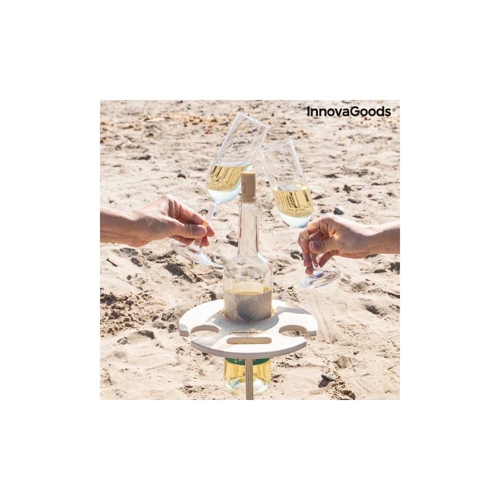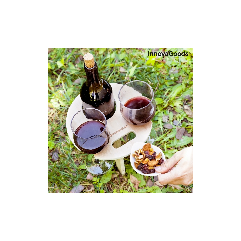 Kokkupandav kaasaskantav veinilaud õues kasutamiseks, mis sobib ideaalselt lõõgastava aja nautimiseks parimas seltskonnas koos hea veiniga. Ideaalne lahendus, et te ei peaks veini, klaase ega suupisteid põrandale jätma, vältides sellega putukate, lekete, mustuse jms teket. See originaalne lubjavineerist laud on vastupidav, kerge, hõlpsasti kokkupandav ja lahti voltitav kasutamiseks või ruumi säästmiseks, et hõlbustada transportimist ja hoiustamist. Seda saab hõlpsasti kaasas kanda ja püsti panna randa, maale, mägedesse, aeda jne. Piisab, kui sisestate selle ühe naelakujulise jala maasse (mulda või liiva) ja see tagab kindla hoidmise. Seda on lihtne sisestada ja eemaldada. Selle tasasel tugialal on auk veinipudeli asetamiseks ja kaks auku kahe veiniklaasi asetamiseks, jättes siiski ruumi väikese kausi suupistete või aperitiivide jaoks. Sellel on ka veel kaks auku (üks pinnal ja teine jalal), mida saab kasutada selle haaramiseks ja käsitsemiseks (üks neist on ka kandesang). Seda on kiire ja lihtne puhastada.