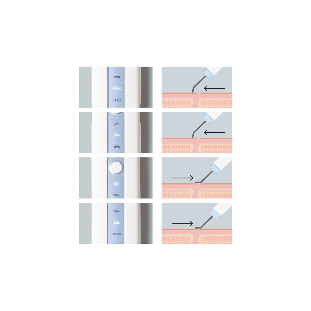 - 4 LED-indikaatoritega režiimi: kasutamise järjestus: 1º Sonic: sügavpuhastus vibratsiooni abil. 2º ion+: kõrvaldab mustpead ja mustuse (ioonid+ meelitavad ebapuhtusi ja toksiine). 3º ion-: parandab niiskustaset ja stimuleerib kosmeetika imendumist, võimendades nende omadusi. 4º EMS: masseerib, pehmendab nahka ja võimendab kosmeetika toimet. Kandke 1º ja 2º puhastusvahendite/toonikutega ja 3º kreemidega. Ärge kasutage igal režiimil rohkem kui 2 minutit ja ärge kasutage samal alal rohkem kui 2 minutit.