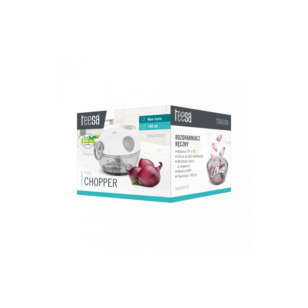 Teesa käeshoitav minijuurviljapurustaja mahutavusega 180 ml, kolme erinevatel tasanditel paigutatud tera abil purustab hõlpsalt sibula, porgandi, pähklid või ürdid.